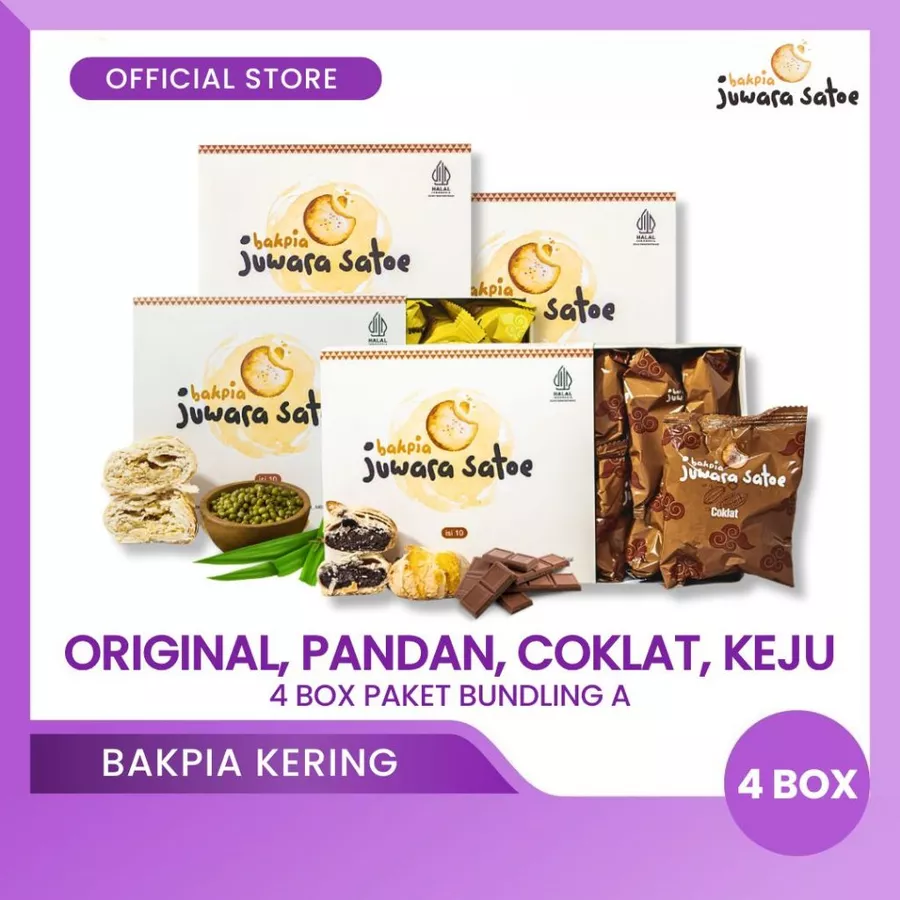 BAKPIA JUWARA SATOE [ 4 Box ] Paket Bundling A (Kering Coklat, Kering Keju, Kering Pandan, Kering Original)